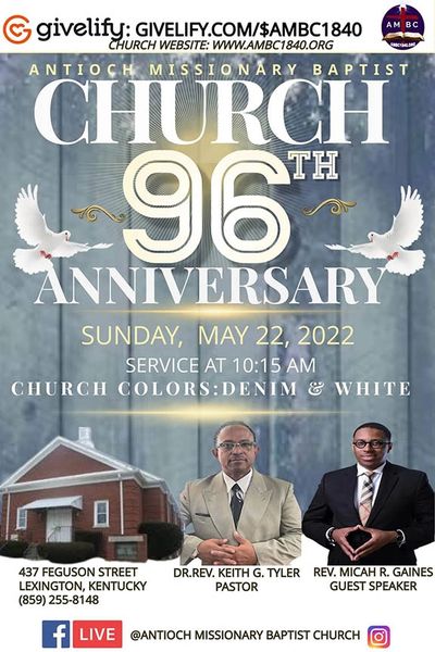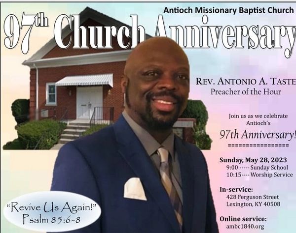Join us at Antioch Missionary Baptist Church as we celebrate our 97th Church Anniversary on May 28, 2023. It will be a wonderful day filled with uplifting worship, joyful fellowship, and heartfelt gratitude for all God has done for us over the past 97 years. We are honored to have Rev. Antonio Taste, Assistant to the pastor, as our guest speaker for this special occasion. With his inspiring words and deep understanding of the gospel, we will be moved and inspired to continue our spiritual journeys. So please mark your calendars and plan to join us for this momentous occasion.