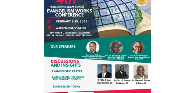 The 4th PNBC Evangelism Board Evangelism Works Conference on February 8 - 10, 2022. For additional information, call, 202.396.0558